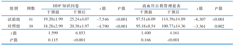 目的 探讨共享护理门诊在妊娠期高血压疾病(hypertensive disorders of pregnancy,HDP)患者孕期保健中的应用效果。 方法 采用便利抽样法,选取2023年1月—10月在南京市某三级甲等妇产医院产检的88例HDP患者作为研究对象。按产检顺序,将2023年6月—10月产检的44例HDP患者作为试验组,2023年1月—5月产检的44例HDP患者作为对照组,试验组实施共享护理门诊管理模式,对照组采用常规管理。干预后比较两组血压控制达标率、疾病进展发生率,HDP知识问卷、高血压自我管理量表、妊娠相关焦虑量表、患者满意度问卷得分的差异。 结果 试验组41例、对照组39例完成研究。干预后,试验组血压控制达标率为95.12%,高于对照组的79.49%;疾病进展发生率为7.32%,低于对照组的25.64%;HDP知识问卷得分为(25.24±4.07)分、高血压自我管理量表得分为(114.39±14.89)分、患者满意度调查问卷得分为(19.56±1.14)分,均高于对照组;妊娠相关焦虑量表得分为(18.02±2.15)分,低于对照组的(23.18±9.58)分,两组比较,差异均具有统计学意义(P<0.001)。 结论 实施共享护理门诊管理可提高HDP患者的血压控制达标率、HDP知识、自我管理水平,降低疾病进展发生率、妊娠相关焦虑,提升满意度,为优化HDP管理提供了借鉴。