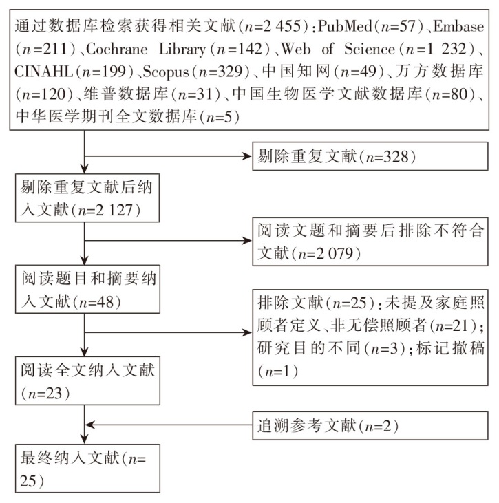 目的 对血液透析患者家庭照顾者负担的相关研究进行范围审查,旨在全面剖析该领域研究现状,为后续研究提供参考。方法 采用范围综述报告框架,检索中国知网、中国生物医学文献数据库、维普数据库、万方数据库、中华医学期刊全文数据库、PubMed、CINAHL、Web of Science、Cochrane Library、Scopus、Embase,检索时限为建库至2025年3月29日,对纳入文献进行汇总和分析。结果 共纳入25篇文献,其中21篇文献报告了家庭照顾者负担的得分/发生率,总体结果以轻至中度负担为主,涉及5种家庭照顾者负担的评估工具,影响因素包括人口学因素、疾病相关因素、社会心理因素、工作经济、照料相关因素和其他6个方面,干预方法包括同伴支持小组、5-A自我管理模式、健康行为教学、问题集中策略等。结论 血液透析患者家庭照顾者负担问题普遍存在,受诸多因素影响,未来亟待开展多中心、大样本的纵向研究和以家庭为中心的干预研究,减少家庭照顾者负担带来的不良影响,提升患者治疗依从性与家庭照顾者身心健康水平。