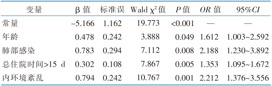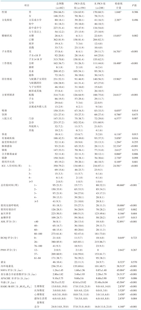 目的 探讨重症患者转出1个月后ICU后综合征(post-intensive care syndrome,PICS)的发生现状及影响因素,为制订个性化干预措施提供依据。 方法 采用便利抽样法,选取2024年4—11月贵州省某三级甲等医院ICU转出1个月的550例患者作为调查对象,收集其一般资料,并在ICU入住期间完成巴氏量表、理查兹—坎贝尔睡眠量表、领悟社会支持量表的测评,在患者转出ICU的1个月后,采用中文版健康老化大脑护理监测问卷通过电话随访的形式完成测评,根据评估结果,将患者分为PICS高危组与无PICS组,采用单因素分析及二元Logistic回归分析其影响因素。 结果 共发放问卷550份,最终回收有效问卷442份,有效问卷回收率为80.3%。其中,194例(43.9%)为PICS高危患者。二元Logistic回归分析显示,年龄大、肺部感染、总住院时间>15 d、内环境紊乱是ICU转出患者发生PICS的高危因素(P<0.05)。 结论 重症患者转出1个月后PICS发生风险较高,医护人员需关注年龄较大、肺部感染及内环境紊乱的患者,并针对不同病情类型制订个性化干预措施,以改善患者的预后。