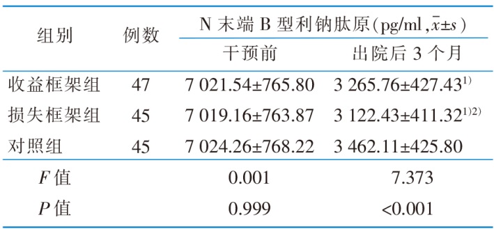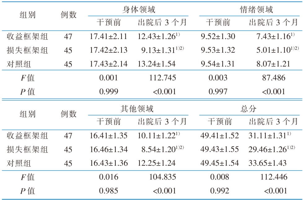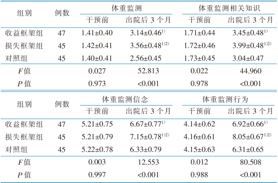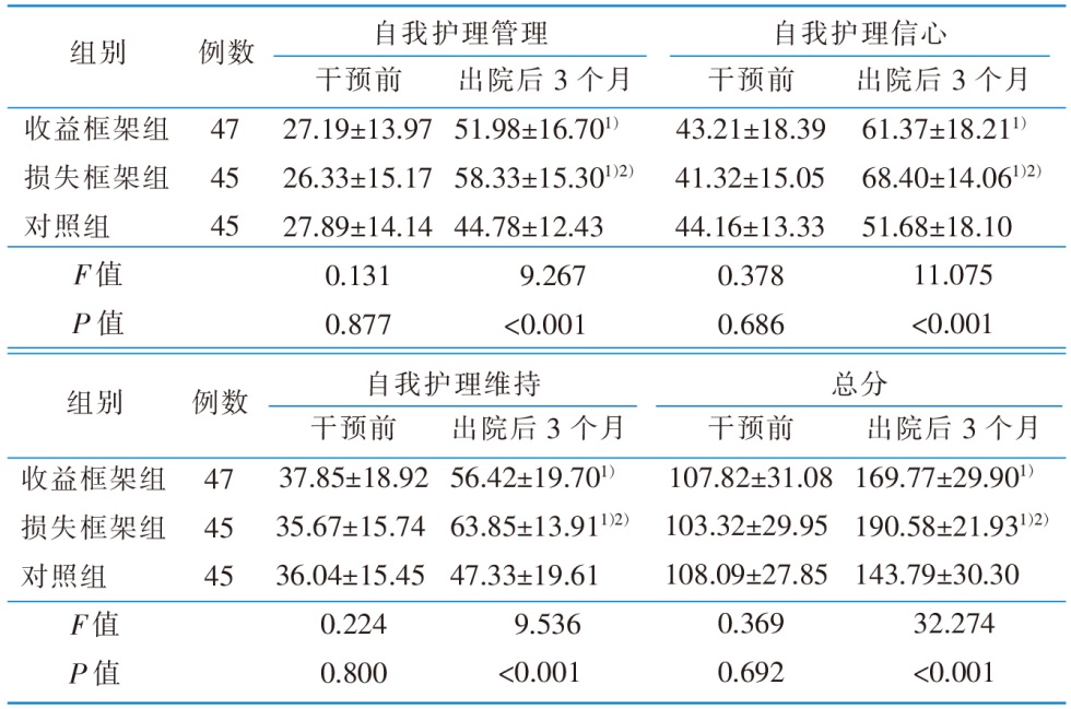 目的 探讨基于不同信息框架的健康教育对老年慢性心力衰竭患者自我管理的影响。 方法 于2023年11月至2024年10月,便利选取江苏省徐州市某三级甲等综合医院心内科收治的住院老年慢性心力衰竭患者健康教育为研究对象,随机分为收益框架组、损失框架组和对照组,每组各47例。收益框架组实施基于收益框架信息的健康教育,损失框架组实施基于损失框架信息的健康教育,对照组进行常规健康教育。比较三组干预前和出院3个月后体重管理情况、自我管理能力、生活质量、N末端B型利钠肽原和再住院率的差异。 结果 最终收益框架组47例、损失框架组45例、对照组45例完成研究。出院3个月后,收益框架组和损失框架组的体重管理量表各维度得分、心力衰竭自我护理指数量表总分及各维度得分均高于对照组(P<0.05),且损失框架组上述得分高于收益框架组(P<0.05);损失框架组明尼苏达心力衰竭生活质量量表总分及各维度得分、N末端B型利钠肽原均低于收益框架组(P<0.05);损失框架组再住院率低于收益框架组和对照组(P<0.05)。 结论 基于不同信息框架对老年慢性心力衰竭患者开展自我管理健康教育能有效提高其自我管理能力,改善生活质量;相比较而言,损失框架的信息更具说服力。