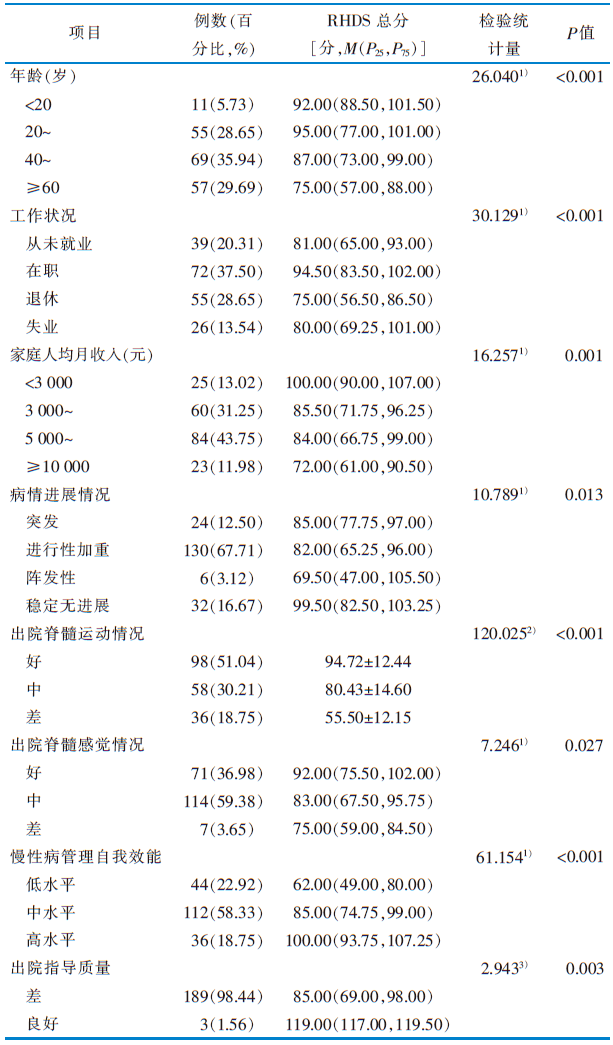 Table 2 The total score and dimension scores of RHDS in patients with spinal vascular malformation after surgery(n=192)
