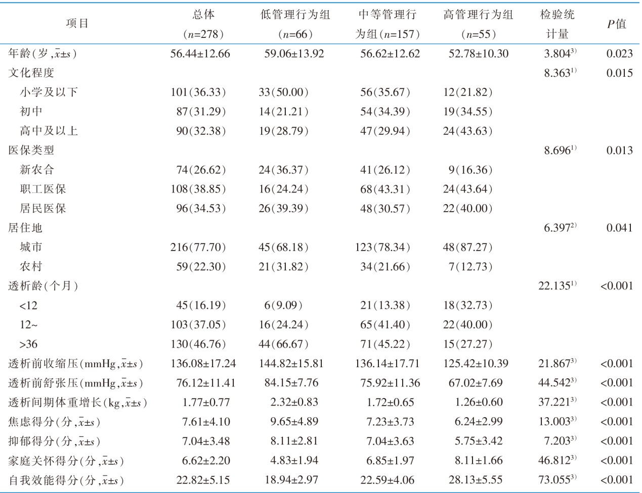 Objective To identify and classify the population characteristics of volume management behaviors in patients undergoing maintenance hemodialysis(MHD) using latent profile analysis(LPA),and to explore the influen-cing factors for each latent profile. Methods A convenience sample of 304 outpatients receiving regular hemodialysis at a tertiary hospital in Anhui Province,were recruited between March 2024 and March 2025. Participants completed questionnaires including a General Information Questionnaire,the Volume Management Behavior Scale for MHD Patients,the Hospital Anxiety and Depression Scale(HADS),the Family APGAR Index,and the General Self-Efficacy Scale(GSES). Latent Profile Analysis and Multivariate Logistic Regression were employed to analyze the latent profiles of volume management behaviors and their influencing factors among MHD patients. Results A total of 278 valid questionnaires were collected,yielding an effective response rate of 91.45%. LPA revealed 3 distinct latent profiles of volume management behaviors:low management behavior group(23.74%),moderate management behavior group(56.48%),and high management behavior group(19.78%). Pre-dialysis blood pressure,interdialytic weight gain,educational attain-ment,dialysis vintage,family support,and general self-efficacy are factors influencing the latent profiles of fluid management behaviors in maintenance hemodialysis patients(P<0.05). Conclusion Significant group heterogeneity exists in volume management behaviors among MHD patients. Healthcare professionals can utilize the distinct category characteristics and influencing factors associated with these different behavioral profiles to formulate targeted nursing intervention strategies,ultimately improving patients’ quality of life.