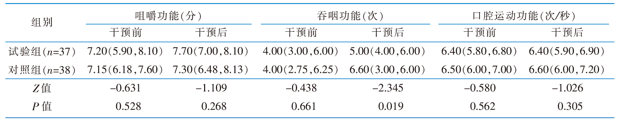 Objective To develop an oral exercise program for older adults and evaluate its application effects,offering insights for oral frailty intervention strategies. Methods The research team constructed a simple and easy oral exercise program for the elderly with oral frailty,based on systematic literature reviews,expert consensuses,and pilot studies. From June 2024 to October 2024,82 older patients with oral frailty were enrolled of Geriatrics Department from a tertiary hospital in Nanjing City. Using Zelen’s design,participants were randomized into an experimental group and a control group,with 41 cases in each group. Participants in the intervention arm underwent a 3-month,oral exercise regimen (2 × 12-minute sessions/day,≥5 sessions/week) adjunctive to standard oral health education. The control group received standard education only. Oral frailty,chewing function,swallowing function and oral motor function of the 2 groups were compared before and after the intervention. Results Ultimately,37 participants were enrolled in the intervention group and 38 in the control group. After the intervention,the intervention group showed significantly better outcomes in oral frailty and swallowing function compared to the control group(P<0.05). However,there were no statistically significant differences between the 2 groups in masticatory function and oral motor function(P>0.05). Conclusion The established oral exercise program can effectively improve swallowing function and oral frailty in the elderly with oral frailty.