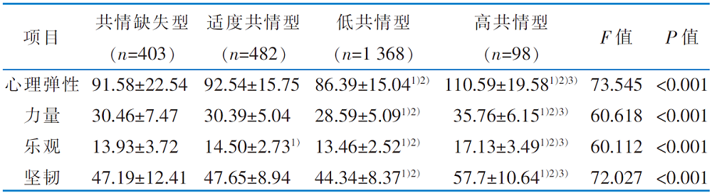 表4 骨科护士疼痛共情潜在剖面与心理弹性的单因素分析结果(n=2 351,分,$\bar{x}\pm s$)