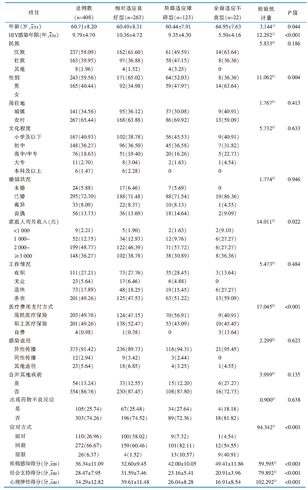 Table 1 Baseline characteristics and univariate analysis of factors influencing psychosocial adaptation categories in elderly HIV patients