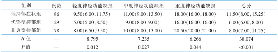 目的 探讨急性期脑卒中患者卒中后抑郁的潜在类别及其与神经功能缺损程度的相关性,为临床医护人员制订针对性的干预措施提供参考。 方法 采用便利抽样法,选取2024年1月—4月在河南省2所三级甲等综合医院神经内科住院的193例急性期脑卒中患者作为调查对象,使用一般资料调查表、美国国立卫生院卒中量表和患者健康问卷进行调查。采用无序多分类Logistic回归分析卒中后抑郁潜在类别与神经功能缺损程度的相关性。 结果 193例急性期脑卒中患者卒中后抑郁得分为(10.22±3.61)分,卒中后抑郁可分为低抑郁症状组(44.6%)、忧郁型抑郁组(15.0%)、非典型抑郁组(40.4%)3个潜在类别,不同潜在类别脑卒中患者的神经功能缺损程度差异具有统计学意义(P<0.001),与重度神经功能缺损相比,轻度缺损患者更可能归于“忧郁型抑郁组”(OR=0.016,P=0.001)和“非典型抑郁组”(OR=0.040,P<0.001),中度缺损患者更可能归于“非典型抑郁组”(OR=0.085,P=0.001)。 结论 急性期脑卒中患者卒中后抑郁存在明显的分类特征,建议医护人员应加大对不同神经功能缺损程度患者的关注,根据卒中后抑郁的不同类别采取针对性的干预措施以减轻其抑郁症状。
