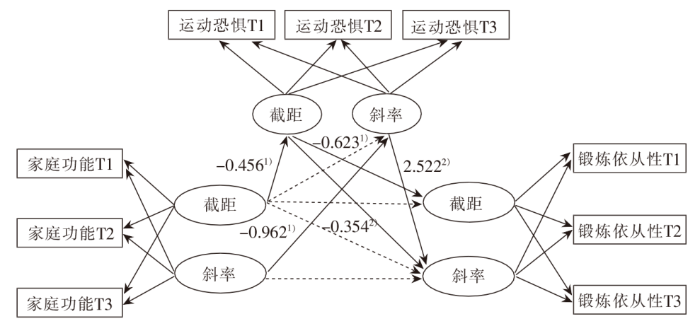 图1 运动恐惧在老年邻近椎体再骨折患者家庭功能及锻炼依从性间的纵向中介模型 注:T1为术前,T2为术后下床前,T3为术后1个月。 1)P<0.001,2)P<0.05。