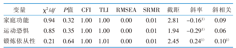 表3 老年邻近椎体再骨折患者家庭功能、锻炼依从性及运动恐惧线性无条件潜变量增长模型的拟合指数和系数(n=232)