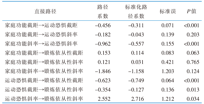 表4 运动恐惧在老年邻近椎体再骨折患者家庭功能及锻炼依从性间的纵向中介模型中的直接路径(n=232)
