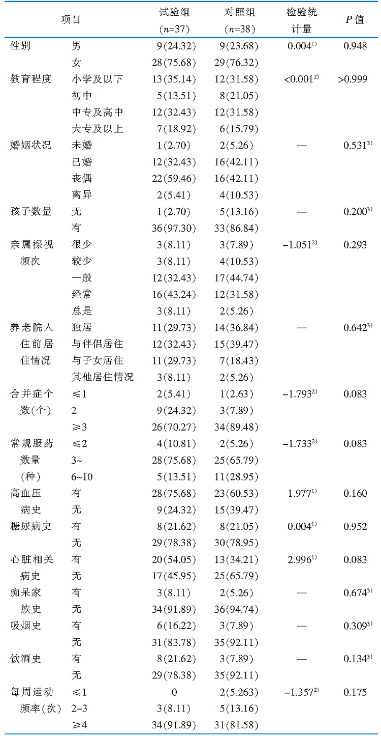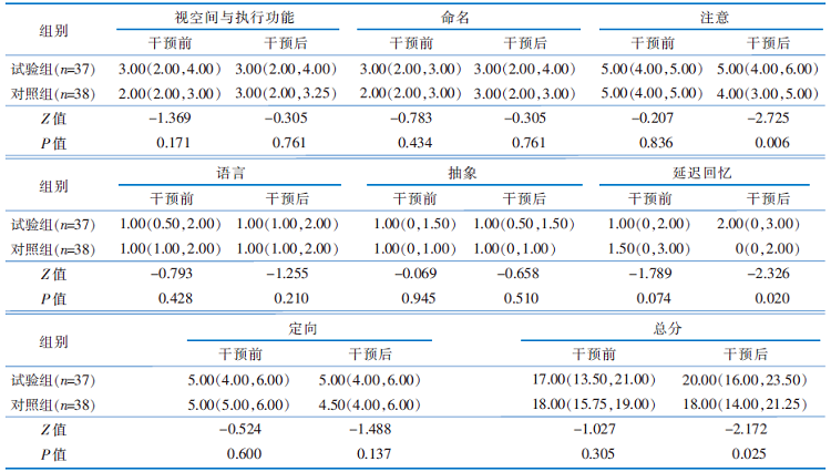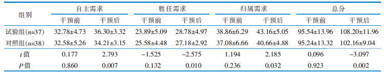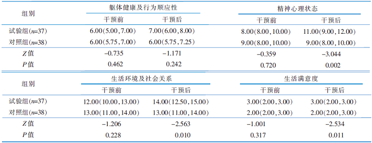 目的 探讨园艺治疗在养老机构轻度认知障碍老年人中的应用效果,为临床实践提供参考。 方法 采用便利抽样法,于2024年3月—9月选取广州市某2所5A级养老机构中的轻度认知障碍老年人为研究对象。采用抽签法,将2所养老机构中2个疗养区的研究对象设为试验组,另外2个疗养区设为对照组,每组各55例。试验组在对照组干预措施的基础上实施园艺治疗,对照组给予园区常规照护及参与日常休闲活动。干预后,比较两组的认知功能、基本心理需求满足程度及生活质量。 结果 试验组有37例、对照组有38例最终完成该研究。干预后,试验组认知功能、基本心理需求满足程度及生活质量优于对照组,差异均具有统计学意义(P<0.05)。 结论 实施园艺治疗能够延缓养老机构轻度认知障碍老年人的认知下降,满足其基本心理需求,提升生活质量。