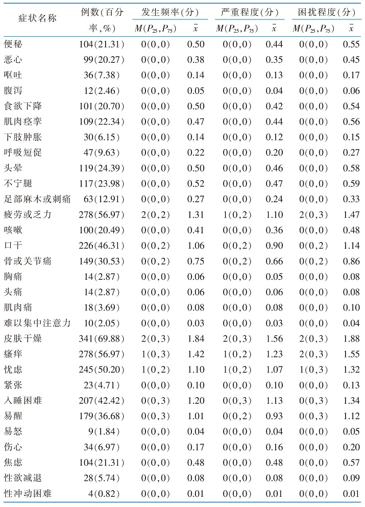 目的 调查维持性血液透析(maintenance hemodialysis,MHD)患者症状现况,从多维症状负担角度分析影响因素、提取症状群并构建症状网络。 方法 以便利抽样法选取2025年3—4月在上海市某三级甲等医院血液净化中心接受MHD的490例患者作为调查对象,采用改良版透析症状指数量表,对MHD患者30个症状进行调查。通过SPSS和R软件分析MHD患者多维症状负担的影响因素、提取症状群并构建症状网络。 结果 回收有效问卷488份,有效问卷回收率为99.59%。患者经历症状的中位数为6(4,8)个,其中发生率前5位的症状分别为皮肤干燥(69.88%)、疲劳或乏力(56.97%)、瘙痒(56.97%)、忧虑(50.20%)和口干(46.31%)。多因素分析结果显示,年龄、透析龄、文化程度、并发症是不同维度症状负担的影响因素。提取出皮肤不适、疲乏疼痛、胃肠道、睡眠障碍、水电解质和尿毒症共6个稳定存在的症状群。不同维度构建症状网络结果均显示,入睡困难的强度中心性最显著(rs=2.18、2.25、2.12)。 结论 MHD患者症状负担重,存在多种影响因素,其症状关联相对稳定,入睡困难是核心症状,识别核心症状及影响因素有助于临床医护人员在症状群管理方面实现高效化和精准化。