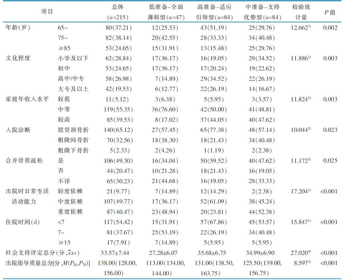 Table 4 Multifactor analysis of potential profiles of discharge readiness among older patients with hip fractures(n=215)
