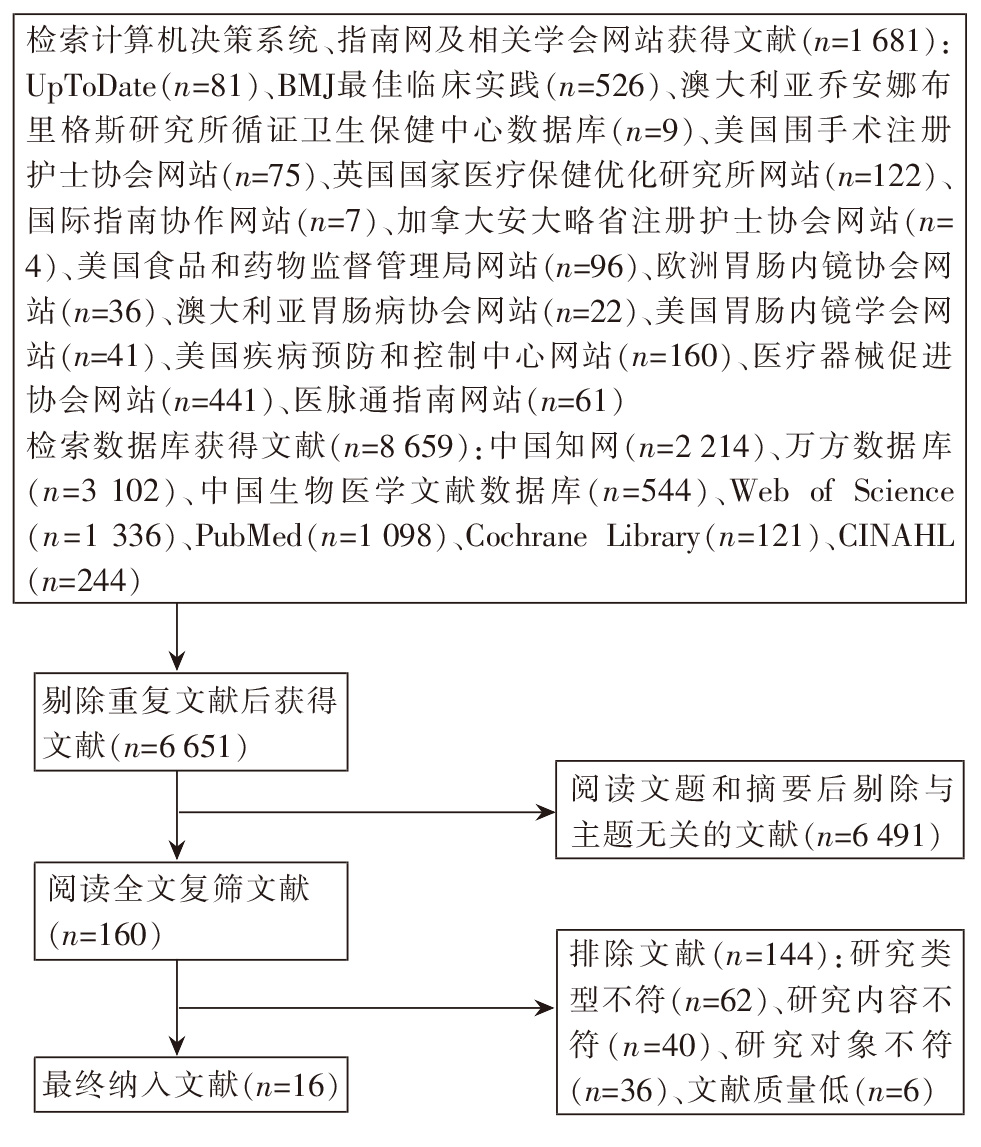 目的 检索和评价手术器械管理的相关证据,并对证据进行整合,为临床手术器械管理实践提供循证依据。 方法 系统检索国内外数据库及相关网站中关于手术器械管理的证据,包括指南、专家共识、临床决策等。检索时限为建库至2024年11月4日。由2名研究人员对文献进行筛选、评价及证据整合。结果 共纳入16篇文献,其中系统评价2篇、类实验性研究1篇、临床决策2篇、专家共识4篇、指南5篇、证据总结2篇,共获得27条证据,包括管理要求、处理一般原则、物流和供应链管理、预处理及灭菌流程、人员培训5个方面。结论 该研究总结了目前关于医院手术器械管理的最佳证据,为医护人员对手术器械的管理提供了循证依据,可提高手术器械处置质量和效率,并有效保障手术患者安全。