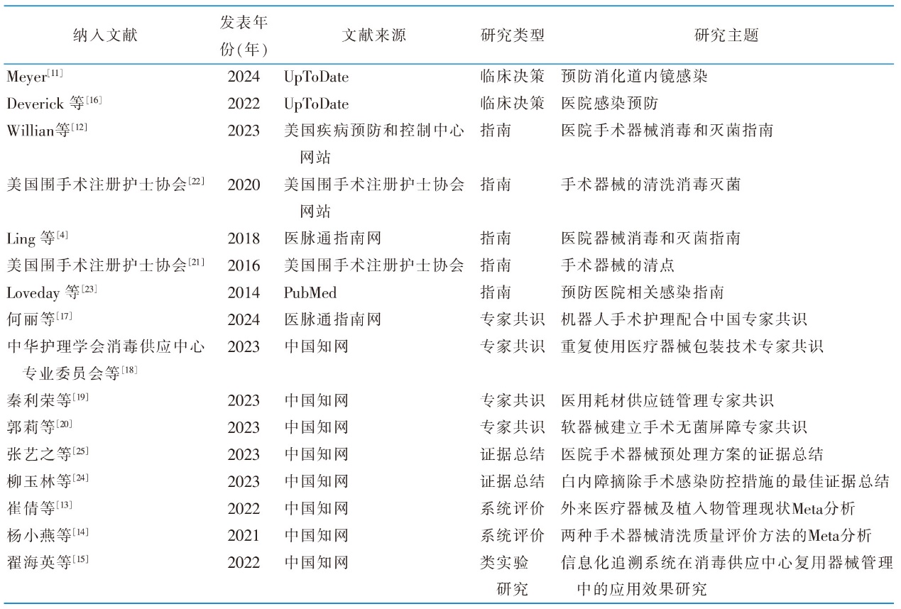 Objective To retrieve and evaluate the evidence related to surgical instrument management,and to integrate the evidence to provide an evidence-based basis for clinical surgical instrument management practice. Methods Evidence on surgical instrument management,including guidelines,expert consensuses,and clinical decision-making,was systematically searched from domestic and international databases and related websites. The search timeframe was from database construction to 4 November 2024. Literature was screened and evaluated,and the evidence was integrated by 2 researchers. Results A total of 16 papers were included,including 2 systematic evaluations,1 class experimental study,2 clinical decisions,4 expert consensuses,5 guidelines,and 2 evidence summaries,resulting in a total of 33 pieces of evidence in 5 areas,including requirements for surgical instrument management,general principles of surgical instrument handling,logistics and supply chain management of surgical instruments,surgical instrument pre-treatment and cleaning,disinfection,and sterilisation processes,and personnel training. Conclusion This study summarises the best available evidence on the management of surgical instruments in hospitals and provides an evidence-based basis for healthcare professionals to manage surgical instruments,thereby improving the quality and efficiency of surgical instrument disposal.