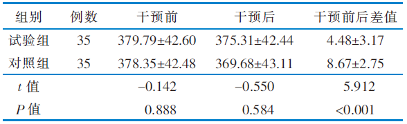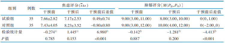 目的 分析放松训练联合运动干预对结直肠癌化疗患者的影响,旨在为临床护理实践提供借鉴。方法 采用便利抽样法,选取2022年11月—2023年11月在常州市某三级甲等综合医院肿瘤科住院的80例结直肠癌化疗患者作为研究对象,采用随机数字表法,将患者分为试验组与对照组,每组各40例,试验组在对照组常规护理的基础上实施放松训练联合运动干预,对照组采用常规护理,比较两组干预前和干预6个化疗周期后6 min步行距离、焦虑评分、抑郁评分和生活质量评分的差异。结果 最终70例患者完成干预,每组各35例。干预后,两组6 min步行距离、焦虑评分、抑郁评分、生活质量评分的差值比较,均有统计学意义(P<0.001)。结论 放松训练联合运动干预可维持结直肠癌化疗患者的运动耐力,在一定程度上缓解焦虑、抑郁情绪,改善其生活质量。
