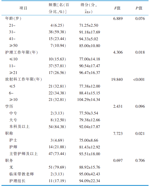 Table 5 Univariate analysis results of general data and knowledge of radiology nurses on prevention and handling of ICM extravasation in Henan Province(n=64)