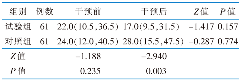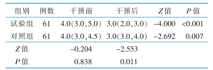 Table 4 Comparison of the total score of the Multiple Symptom Assessment Scale(MDASI-LC) between the 2 groups before and after intervention[scores,M(P25,P75)]