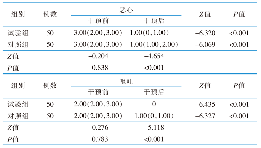 Objective To explore the effectiveness of auricular Gua Sha based on auricular vagus nerve stimulation in patients with chronic renal failure accompanied by nausea and vomiting. Methods Using a convenience sampling method,100 patients with chronic renal failure and nausea and vomiting admitted to the Nephrology Department of a tertiary hospital in Zhejiang Province between January 2022 and December 2023 were selected.They were randomly divided into a test group and a control group,with 50 patients in each group.The test group received the conventional treatment and care for chronic renal failure with nausea and vomiting,along with auricular Gua Sha,with a 3-day intervention.The control group received only conventional treatment and care.The Traditional Chinese Medicine(TCM) symptom scores for nausea and vomiting,total effective rate of the efficacy index,symptom improvement time,total number of bowel movements,and adverse events were compared between the 2 groups. Results A total of 100 patients completed the study.After intervention,the scores for nausea and vomiting symptoms were lower in both groups compared to the scores before intervention,with the experimental group having lower scores than the control group(P<0.001);the total effective rate of the experimental group was 98.00%,higher than 88.00% in the control group(P<0.001).Following intervention,the time for improvement of nausea and vomiting symptoms in the experimental group was(7.50±1.74) minutes,shorter than(13.38±2.31) minutes in the control group(P<0.001);the total number of bowel movements in the experimental group was(3.34±0.63) times,more than (2.46±0.58) times in the control group(P<0.001);no adverse events occurred during the study. Conclusion Auricular Gua Sha based on auricular vagus nerve stimulation helps reduce nausea and vomiting symptom scores,improves the total effective rate of the efficacy index,shortens the symptom improvement time,increases the frequency of bowel movements,and it is safe for patients with chronic renal failure.