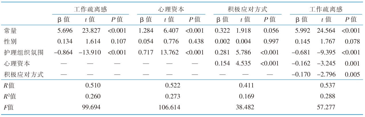 关键词: 组织氛围, 工作疏离感, 心理资本, 积极应对方式, 精神科护士, 护理管理研究