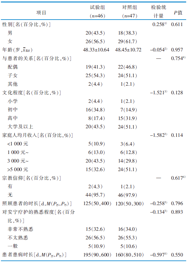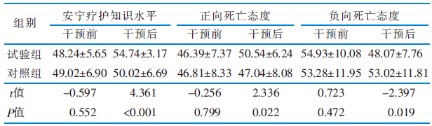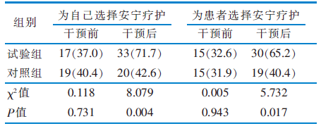 目的 构建晚期癌症患者家属安宁疗护决策支持教育方案并探讨其应用效果,旨在提高家属对安宁疗护的认知水平及接受度。方法 以渥太华决策支持框架为理论指导,基于文献回顾、质性访谈及专家函询结果拟订方案。采用便利抽样法,选取2023年9月—2024年1月在天津市某三级甲等医院住院的晚期癌症患者的家属作为研究对象,采用随机数字表法分为试验组48名和对照组49名。试验组在常规护理的基础上应用安宁疗护决策支持教育方案进行干预,对照组实施常规护理。比较两组干预前后的安宁疗护知识水平、死亡态度以及安宁疗护的选择意愿。结果 最终构建的方案包括4个一级条目、15个二级条目、59个三级条目。在方案应用阶段,有4名家属主动退出研究,最终试验组纳入46名、对照组47名。干预后,试验组安宁疗护知识水平高于对照组,正向死亡态度得分高于对照组,负向死亡态度得分低于对照组,差异均具有统计学意义(P<0.05);试验组为自己及患者选择安宁疗护的意愿均高于对照组,差异具有统计学意义(P<0.05)。结论 该研究构建的方案具有科学性、可行性,实施该方案可以提高晚期癌症患者家属的安宁疗护知识水平、改善其死亡态度,提高家属对安宁疗护的选择意愿。