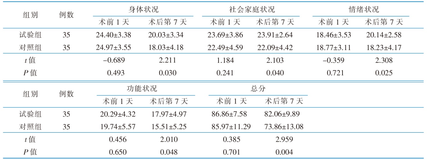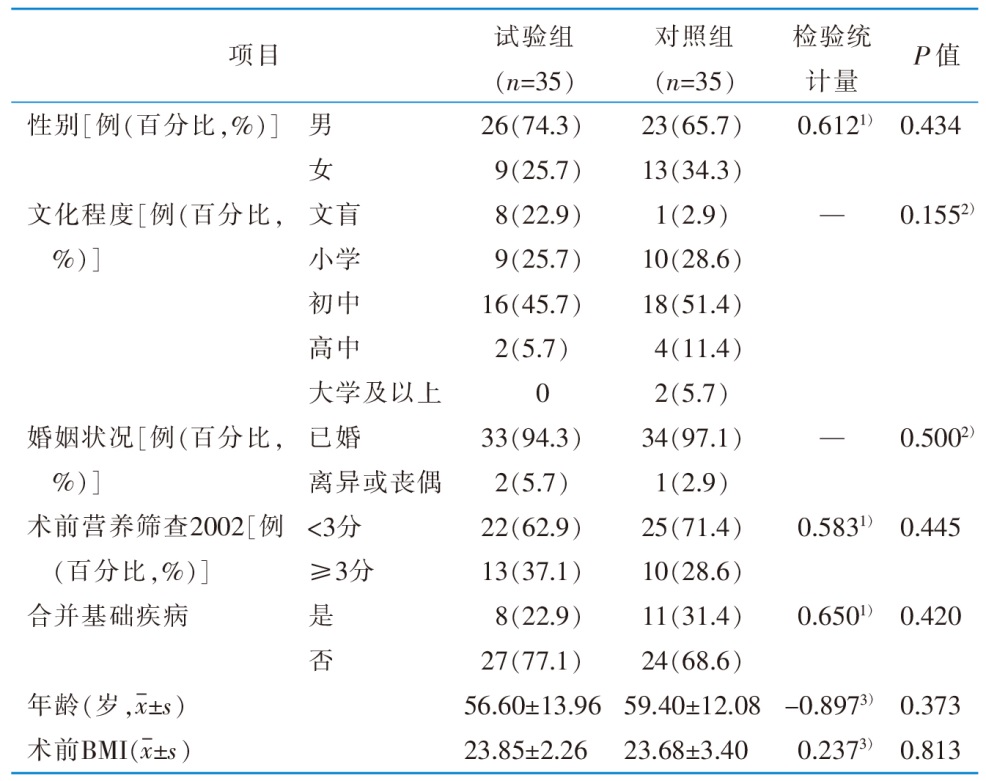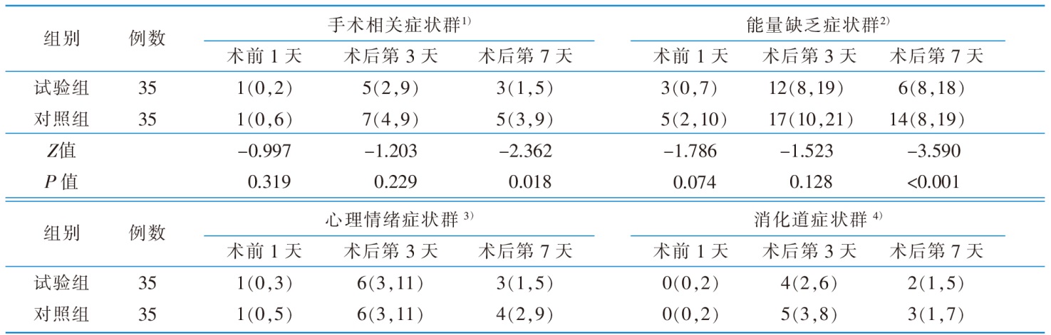 目的 构建胃癌患者术后抗阻运动方案并探讨其应用效果,旨在为临床护理实践提供借鉴。方法 基于互动达标理论,通过文献研究、专家会议、预试验构建胃癌患者术后抗阻运动方案。采用便利抽样法,选取在浙江省某三级甲等医院胃外科拟行胃癌根治术的患者为研究对象,2024年1月—3月住院的36例患者作为试验组,2023年11月—12月住院的36例患者作为对照组。试验组在常规快速康复外科护理的基础上接受抗阻运动方案干预,对照组接受常规快速康复外科护理。术前1天、术后第3天、术后第7天,采用安德森症状评估量表-胃肠道肿瘤特异性模块、癌症治疗功能评价量表-共性模块进行评估,并统计不良事件发生率。结果 方案应用过程中,试验组、对照组各剔除1例,最终纳入70例。广义估计方程分析结果显示,两组手术相关症状群及能量缺乏症状群时间与组间存在交互效应(P<0.05);简单效应分析显示,术后第7天,试验组、对照组的手术相关症状群得分分别为3(1,5)、5(3,9)分,能量缺乏症状群得分分别为6(8,18)、14(8,19)分,差异具有统计学意义(P<0.05)。术后第7天,试验组、对照组的生活质量得分分别为(82.06±9.89)(73.86±13.08)分,差异具有统计学意义(P=0.004)。两组均未发生不良事件。结论 该研究构建的胃癌患者术后抗阻运动方案具有科学性、安全性及可行性,可改善胃癌术后患者手术相关症状群及能量缺乏症状群,并提高其生活质量。