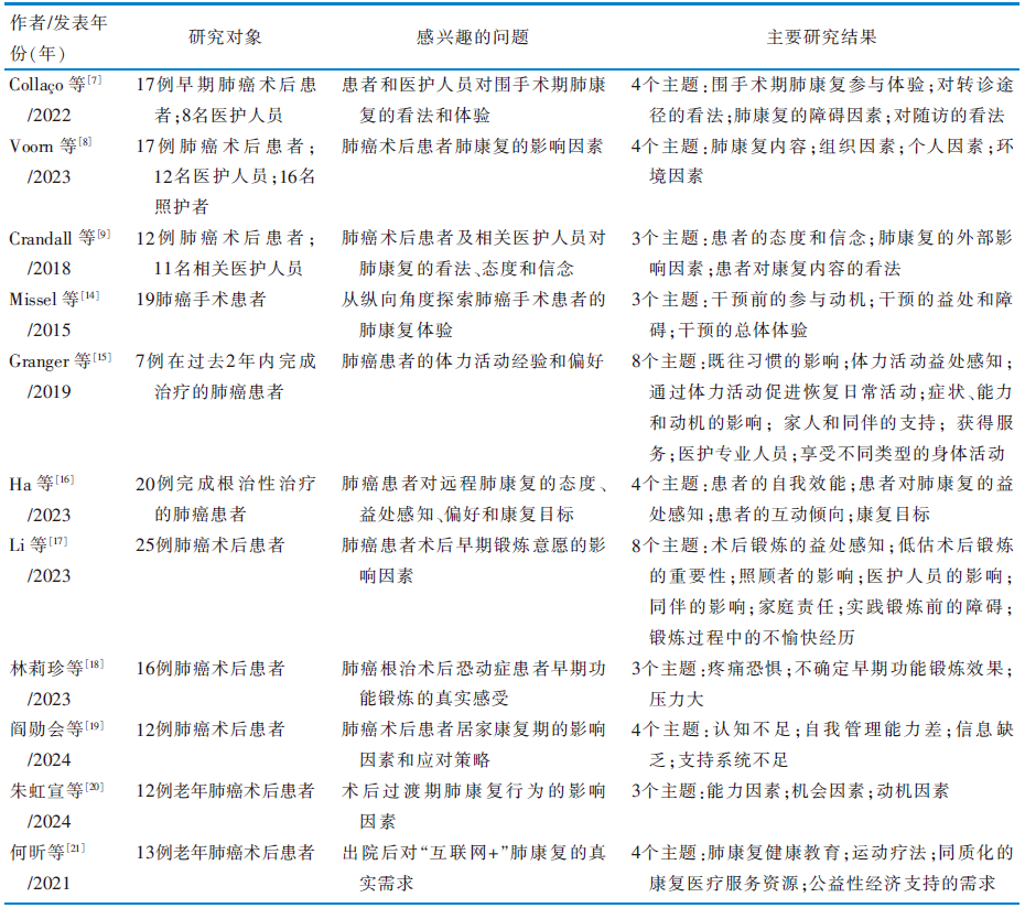 关键词: 肺肿瘤, 肺康复, 影响因素分析, Meta整合, 质性研究, 循证护理学
