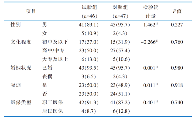 试验组2例主动退出,对照组1例因病情变化再次入院,最终试验组纳入46例,对照组纳入47例。试验组年龄为(65.57±5.20)岁,对照组年龄为(66.79±4.90)岁,两组比较,差异无统计学意义(t=1.167,P=0.246);试验组病程为10.06(5.00,20.00)年,对照组为10.00(3.00,10.00)年,两组比较,差异无统计学意义(Z=-1.118,P=0.264)。两组其他一般资料的比较见表2。