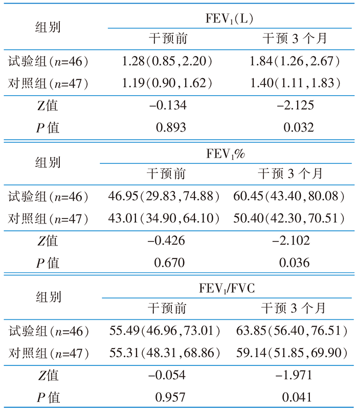 表3 干预前后两组肺功能的比较[M(P25,P75)]