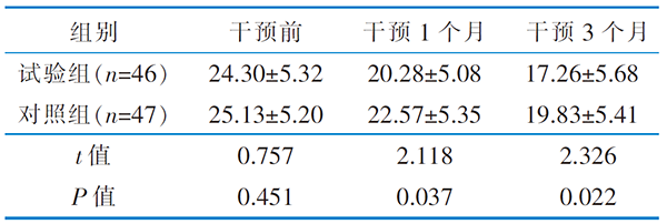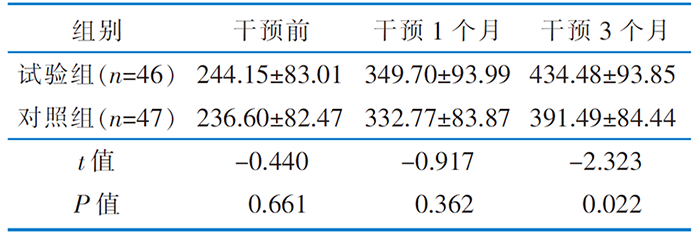 干预1个月时,试验组运动依从性得分为(39.22±4.86)分,对照组为(30.68±4.23)分,两组比较,差异有统计学意义(t=9.041,P<0.001);干预3个月时,试验组运动依从性得分为(36.87±4.36)分,对照组为(28.98±4.20)分,两组比较,差异有统计学意义(t=8.890,P<0.001)。
